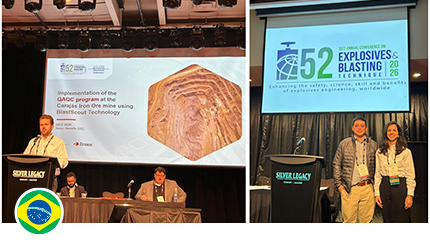 The company participated with a booth, and Enaex Brasil made a significant contribution to the technical program with two presentations developed in partnership with clients. On January 22, Fabiano Veloso Ferreira, from Vale, and Augusto Ferraz, EMTS – Enaex Brasil, presented the topic Implementation of the QAQC Program at the Carajás Iron Ore Mine Using BlastScout Radar Technology. Two days later, Renato Iwamoto, from Huaxin, and Thais Costa, EMTS – Enaex Brasil, delivered the presentation Enhancing Quarry Efficiency Through Electronic Detonators, featuring a case study from the Itapeti Quarry in São Paulo.
